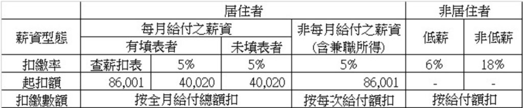 - 居住者 (Resident): 按「薪資扣繳稅額表」查表扣,或是固定扣 5%(外商通常選 5%)。