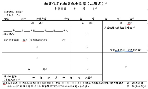 包租業向房客收取租金時,應開立**「租賃住宅包租業租金收據」。此收據免徵印花稅**,且不含營業稅。